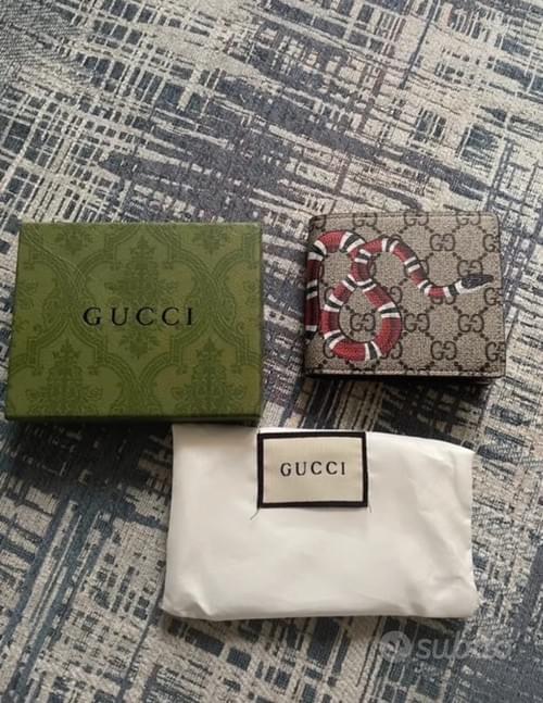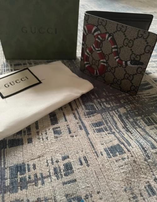 Con i suoi colori brillanti, il sinuoso Kingsnake fa parte dei simboli distintivi della Maison ed è qui stampato su un portafoglio in tessuto GG Supreme, nella combinazione di nero e grigio.
