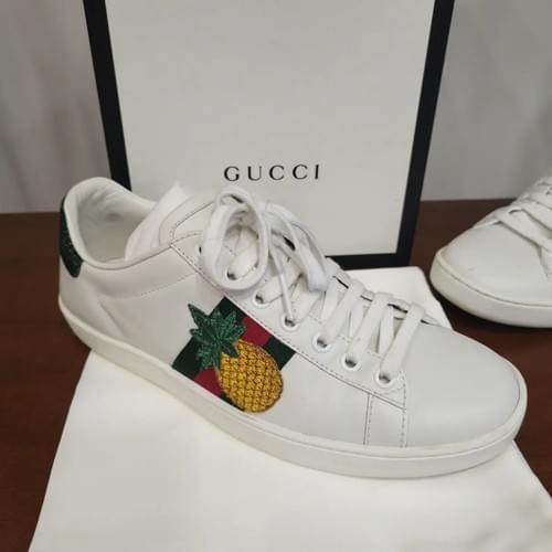 Le Sneakers Gucci Ace con ananas reinterpretano il classico design della Maison con un tocco fresco, ironico e vivace. Realizzate in pelle bianca premium, si distinguono per l’originale ricamo o stampa di un ananas sul lato, simbolo di allegria, estate e spirito esotico.